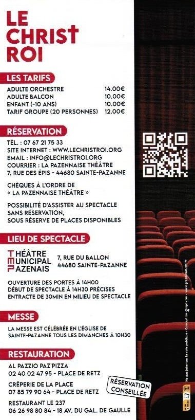 Cette année, le spectacle du Christ Roi se produira au théatre TMP entièrement rénové (théatre Jeanne d’Arc) de Sainte Pazanne.